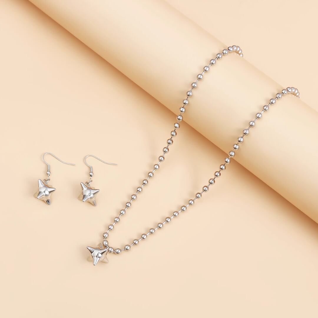 Metallic iron cone and steel bead clavicle chain necklace and earrings (NC136)